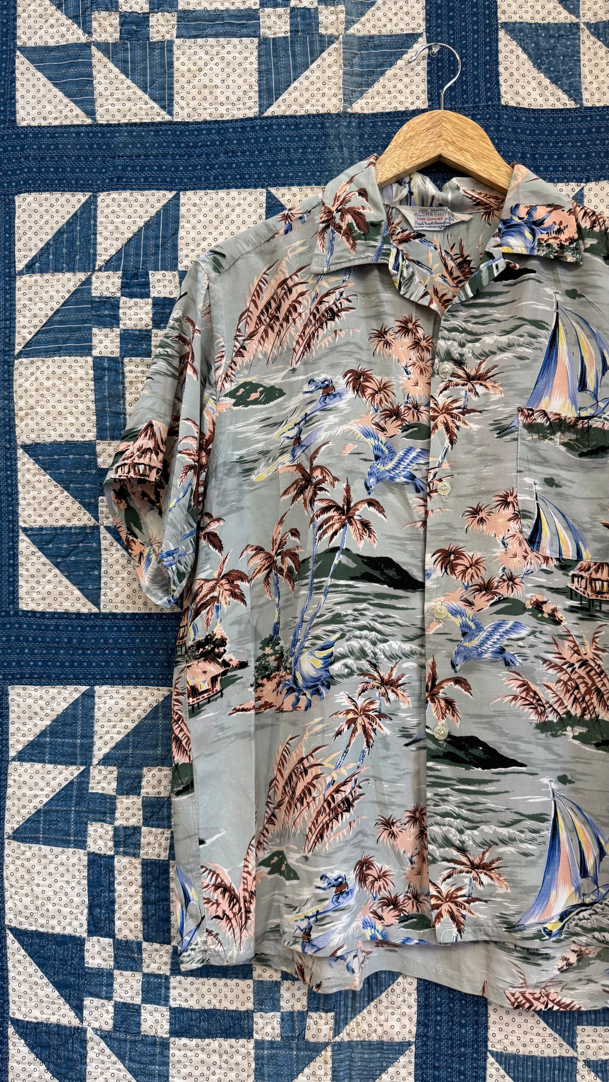 1950's pastel colored "Aloha Shirts" Hawaiian shirt. Button down from, loop collar, one front open breast pocket. Marked a size medium.