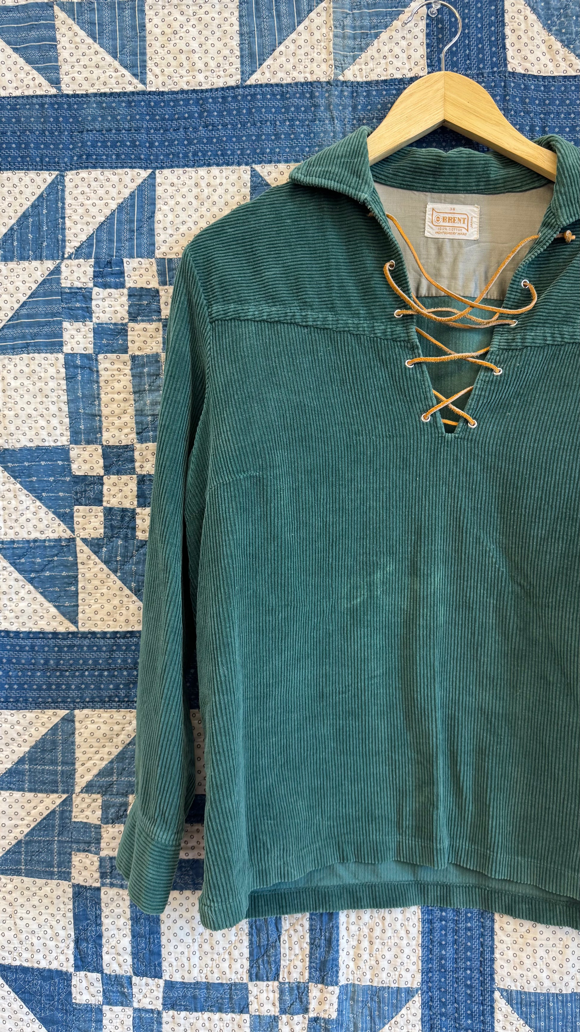 1960's forest green corduroy tunic with rawhide tie closure at neck. Button detail at cuffs and slits at hem.