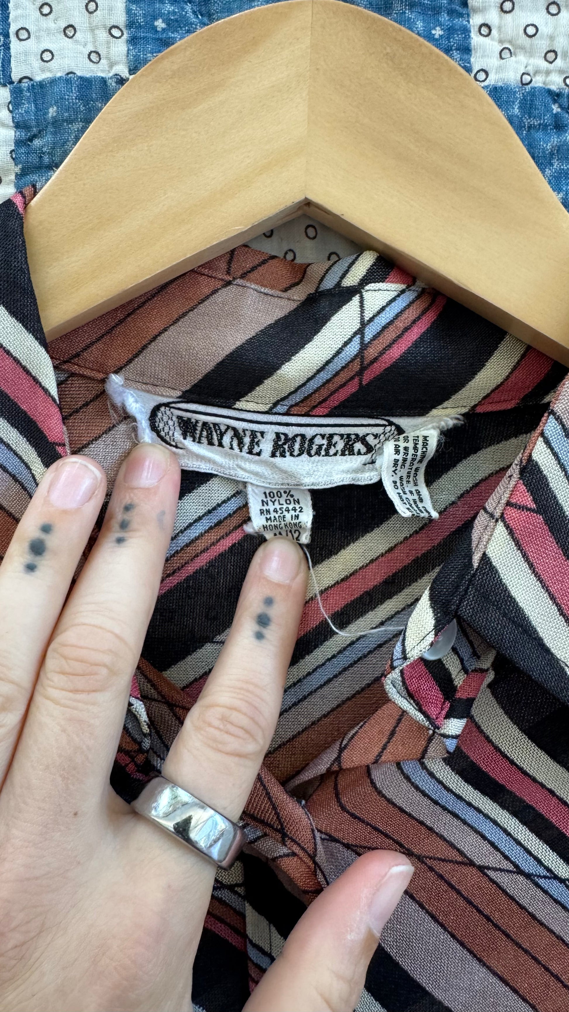 1970's metallic diagonal striped see-thru nylon button up shirt with dagger collar.