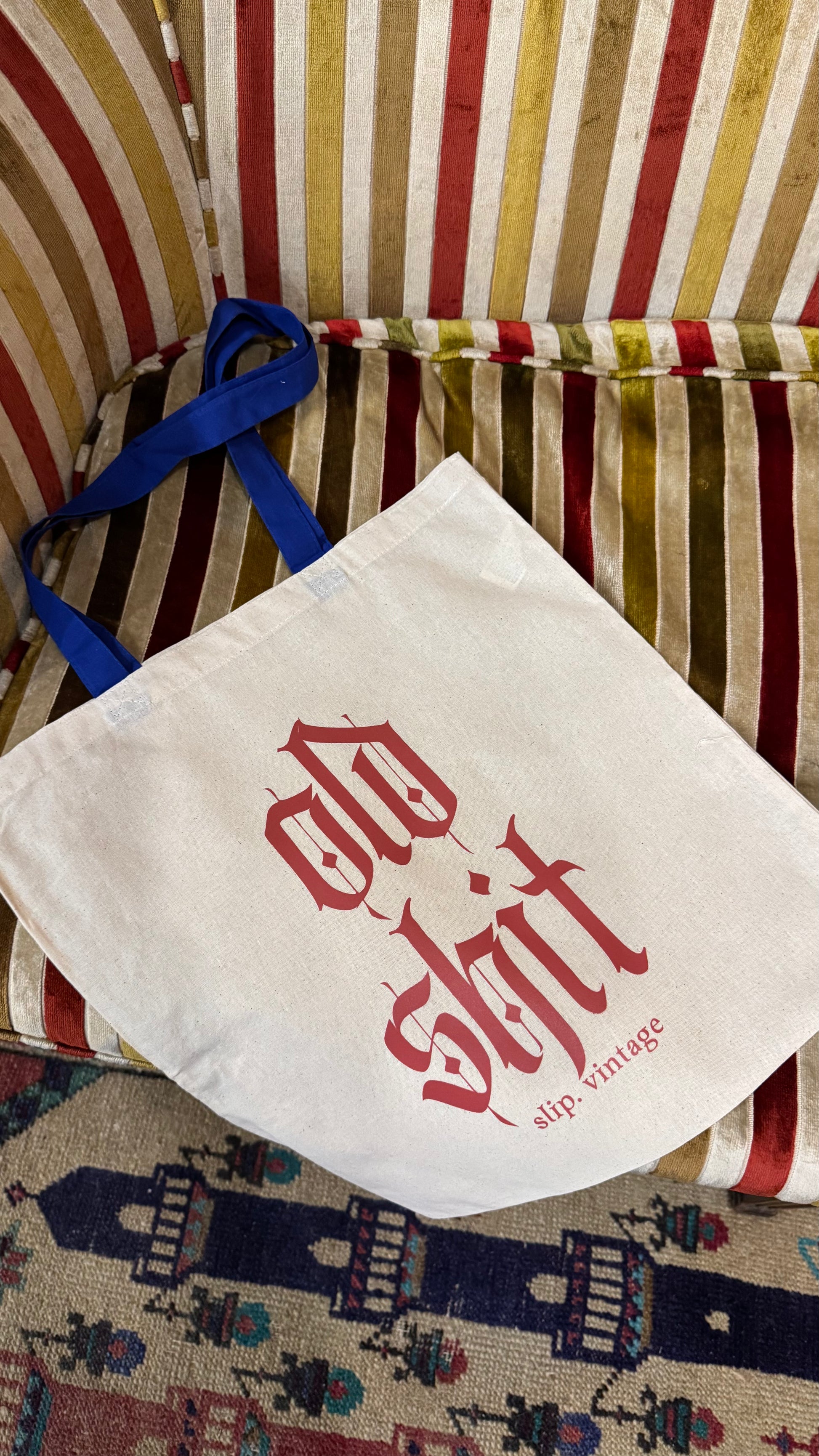 Iron on "Old Shit" slip. vintage tote bag. 100% Cotton, square shape with blue handles.