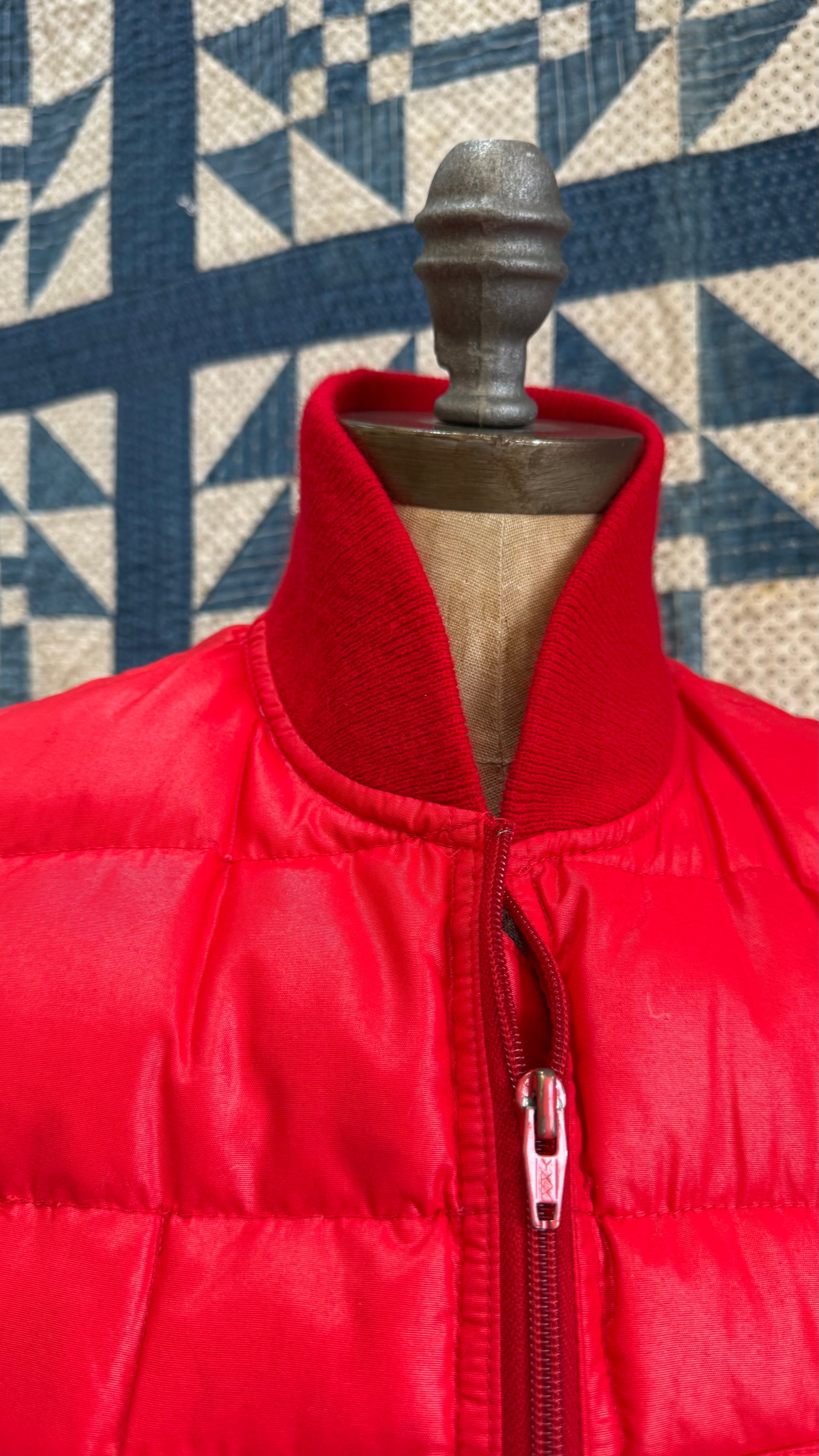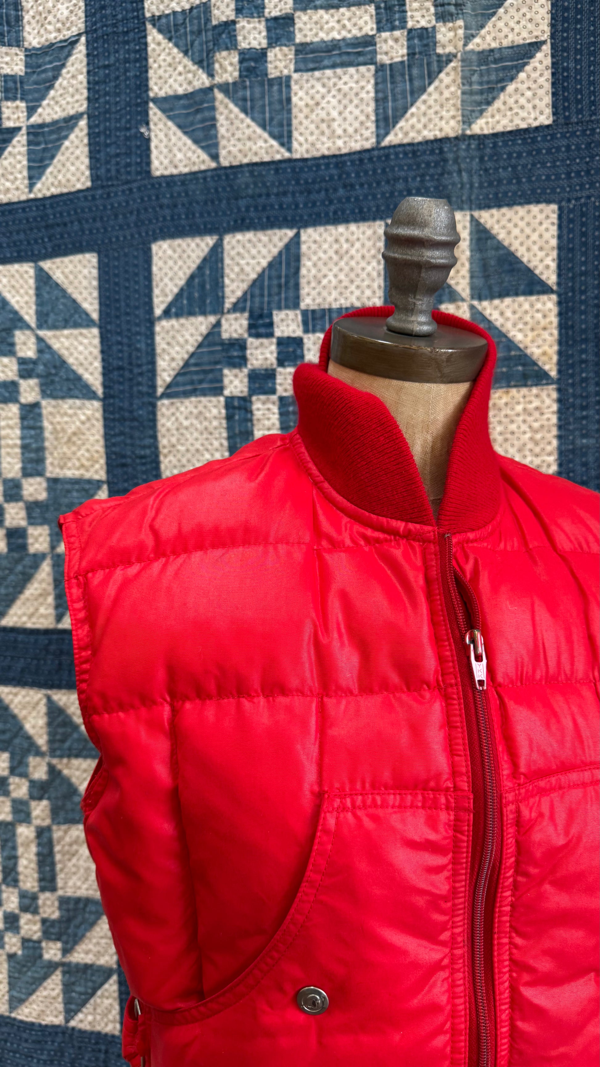 1980's bright red Obermeyer puffer vest with zipper closure up front, snap button pockets, quilted with what feels like down. Knit collar, belt on back with snaps to make waist more or less defined.