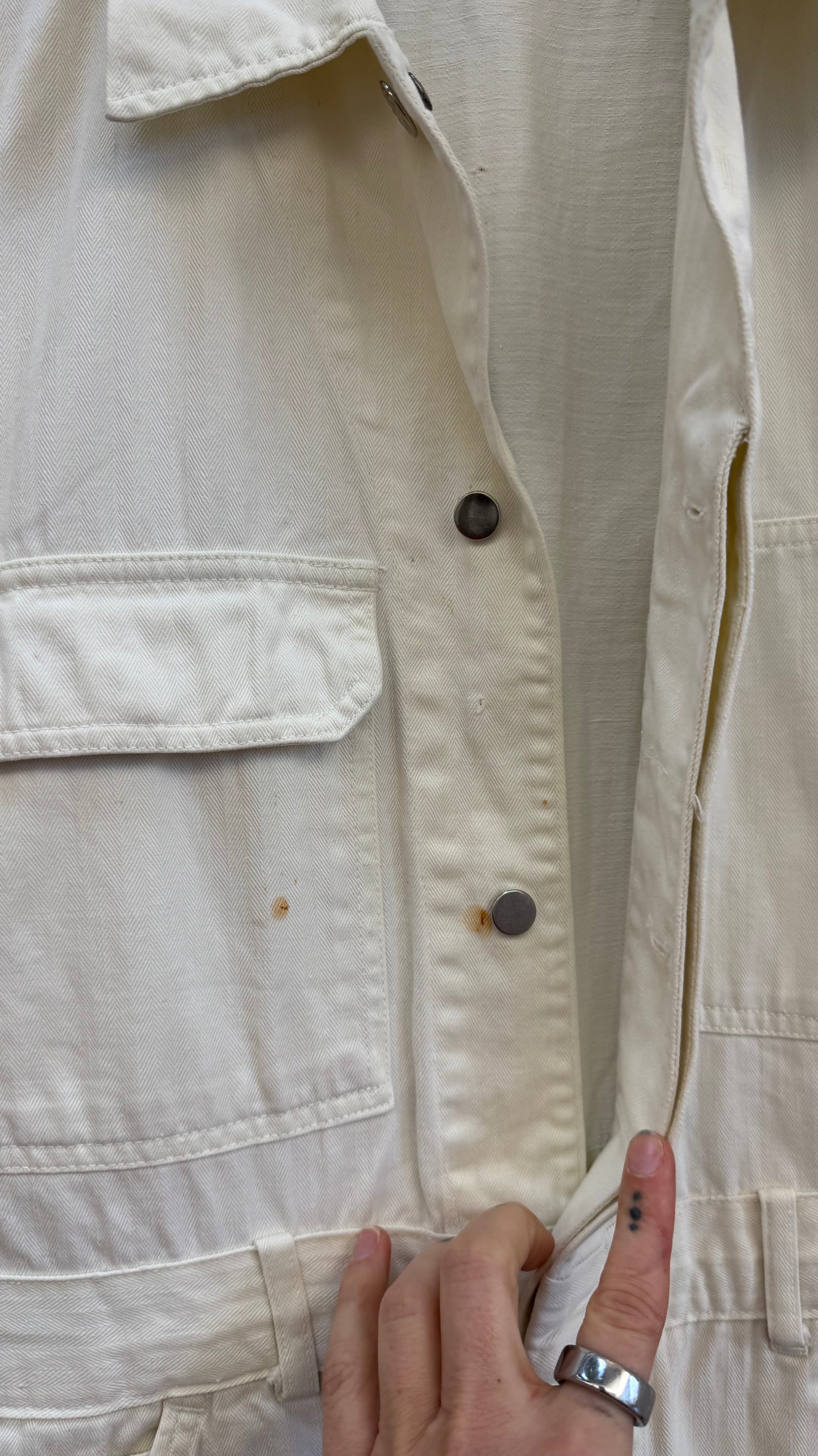 1950's Kangaroo Brand white herringbone twill coveralls with button front closure, button closure at cuffs, waistband with belt loops, front breast patch pocket with flap, and back patch pockets.